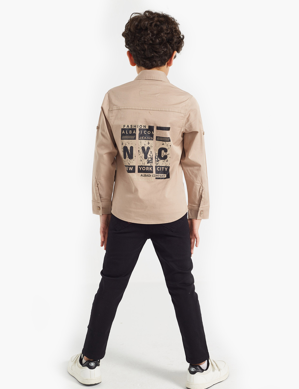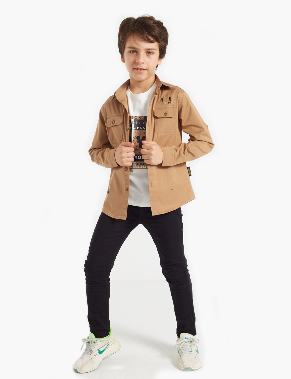 A unique double set for boys, consisting of a simple shirt with front pockets and a row of buttons for closure, along with a white T-shirt printed with attractive graphics and letters.