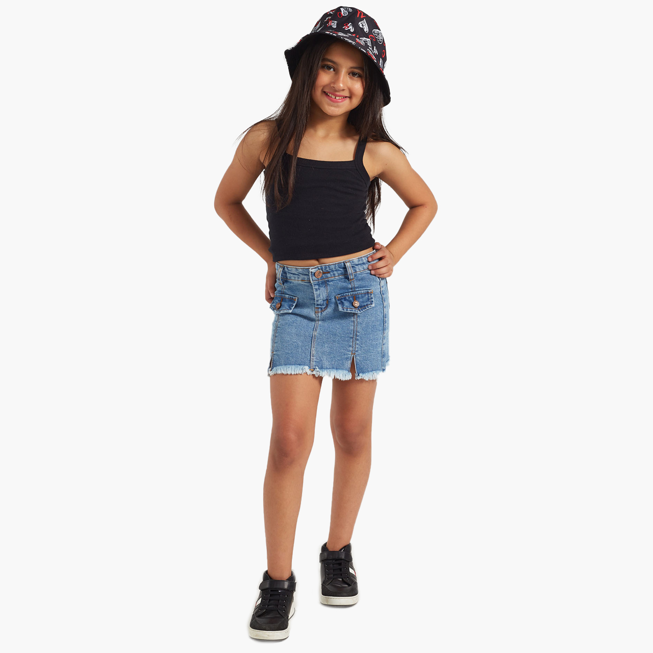 Girl's mid-rise jeans skirt with a modern design, featuring two front pockets and two bottom openings with raw edges.