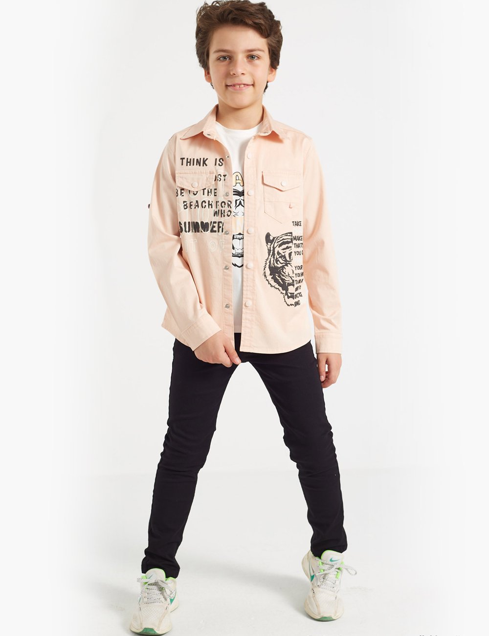 A double set that combines a gabardine shirt decorated with colorful letters and tiger face prints with a white T-shirt decorated with the same letters and tiger drawing, representing a unique presence of elegance and appeal, has front pockets and a row of buttons for easy closure.