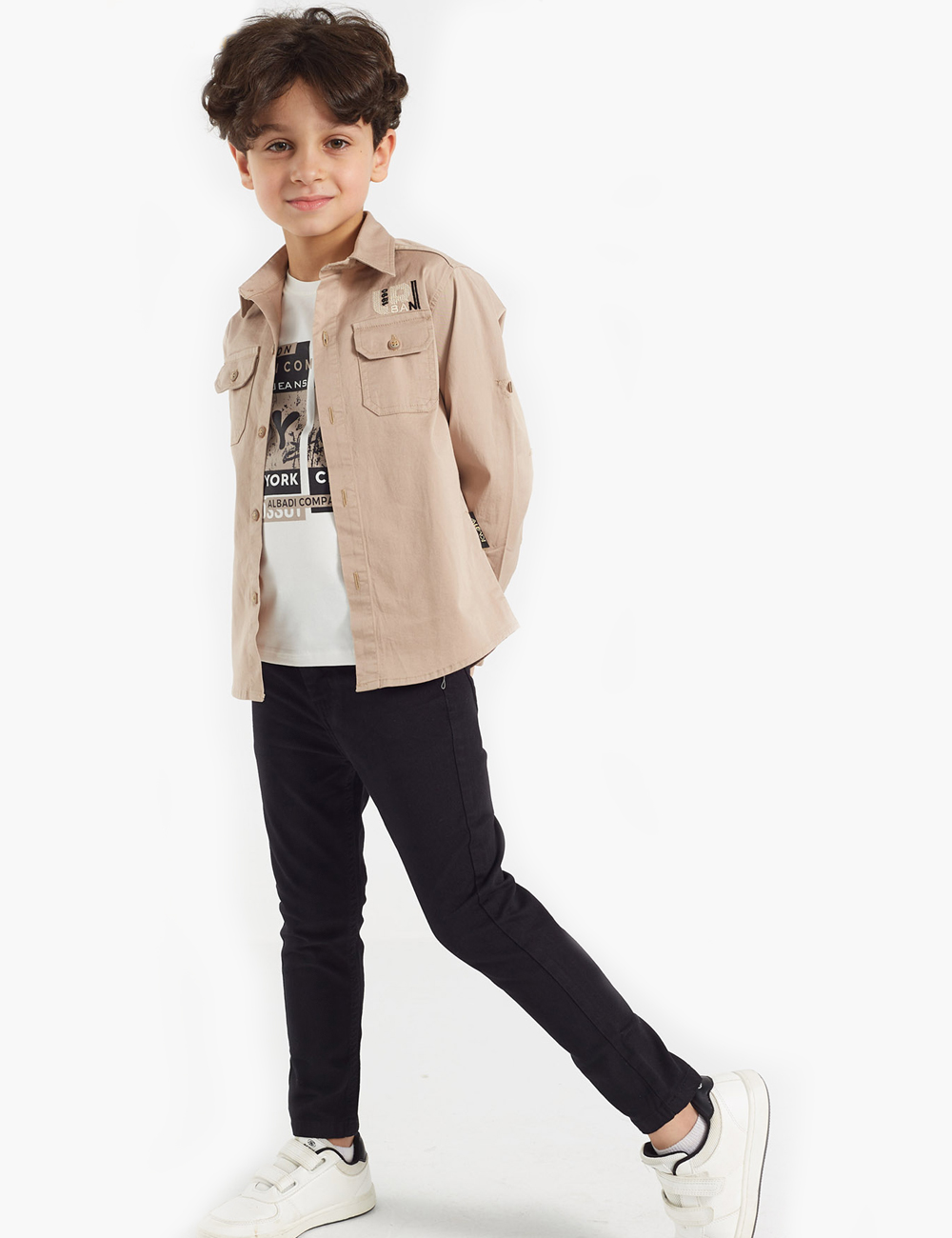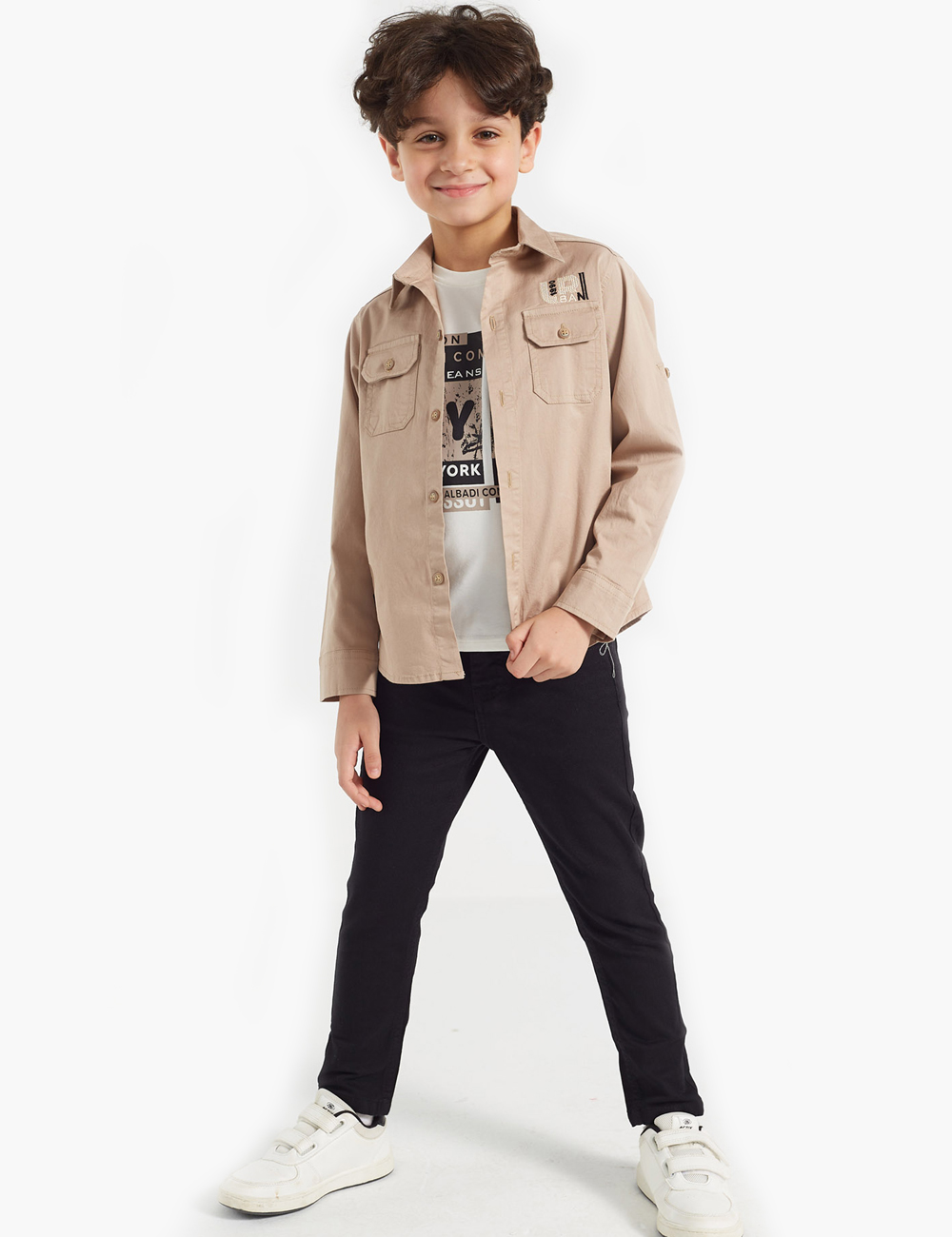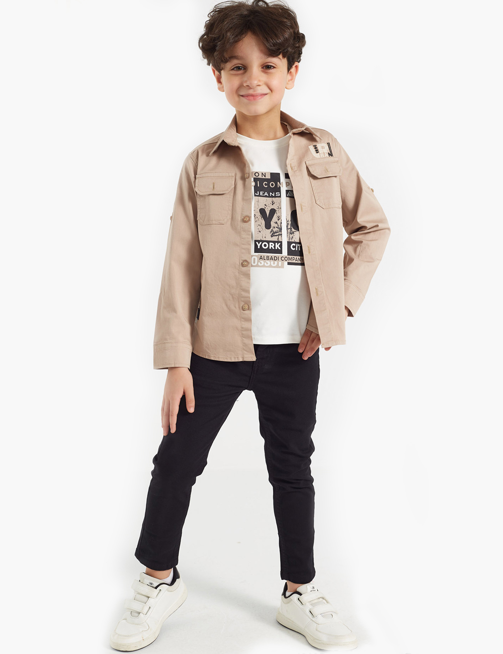 Discover an exceptional double set for boys, featuring a simple shirt with front pockets and a row of buttons on the closure, in addition to a white t-shirt adorned with attractive graphics and letters.