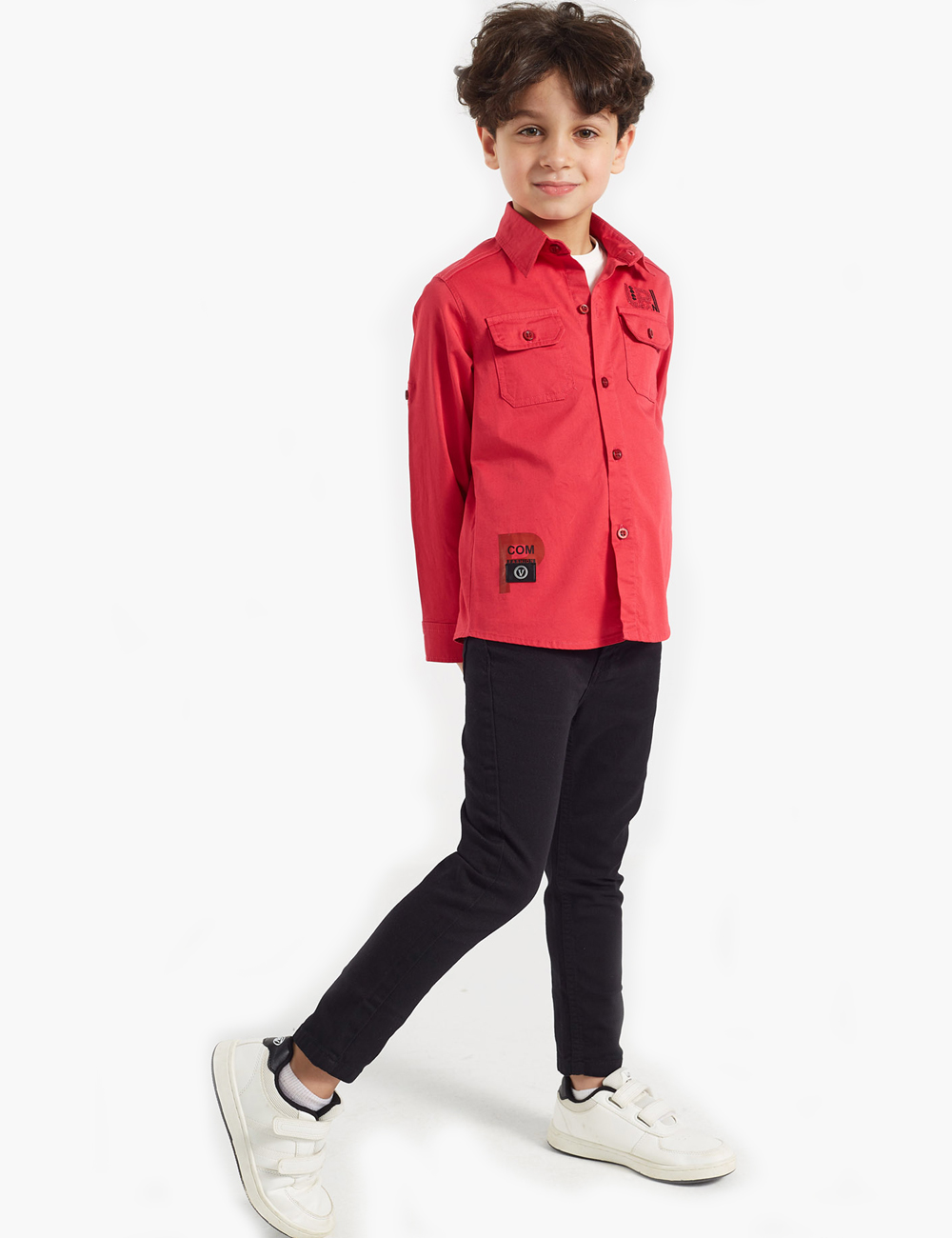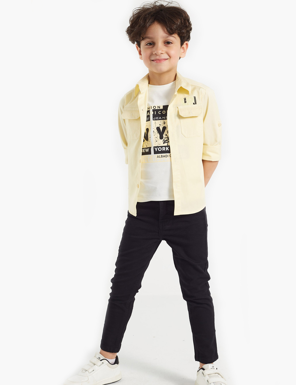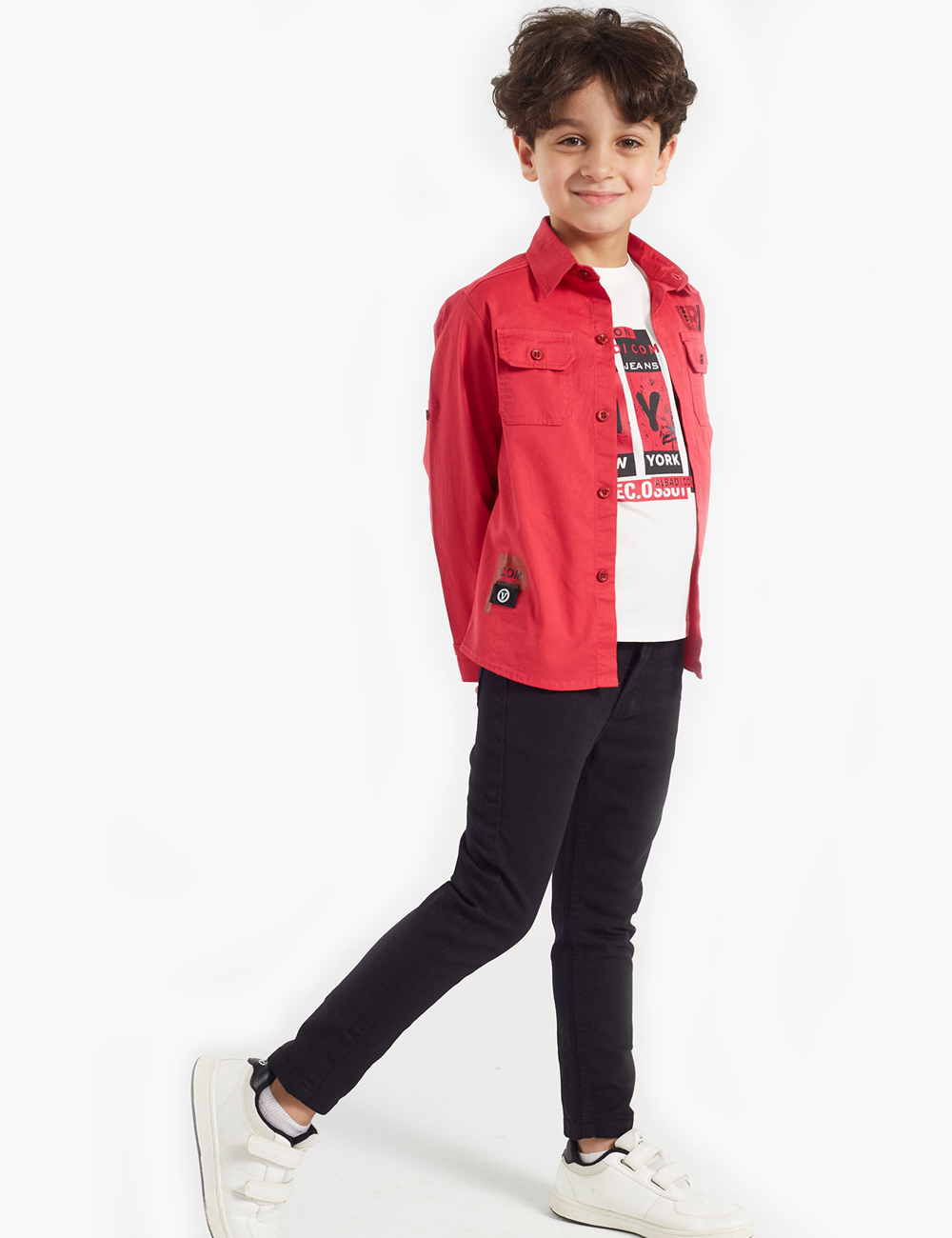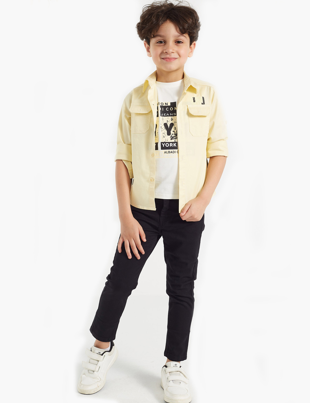 Discover an exceptional double set for boys, featuring a simple shirt with front pockets and a row of buttons on the closure, in addition to a white t-shirt adorned with attractive graphics and letters.