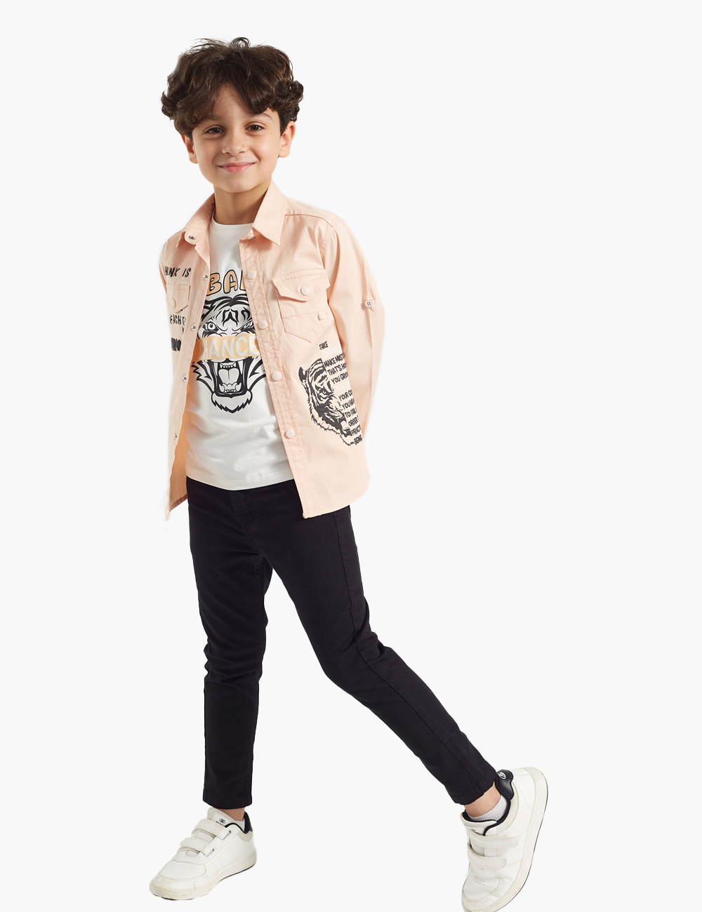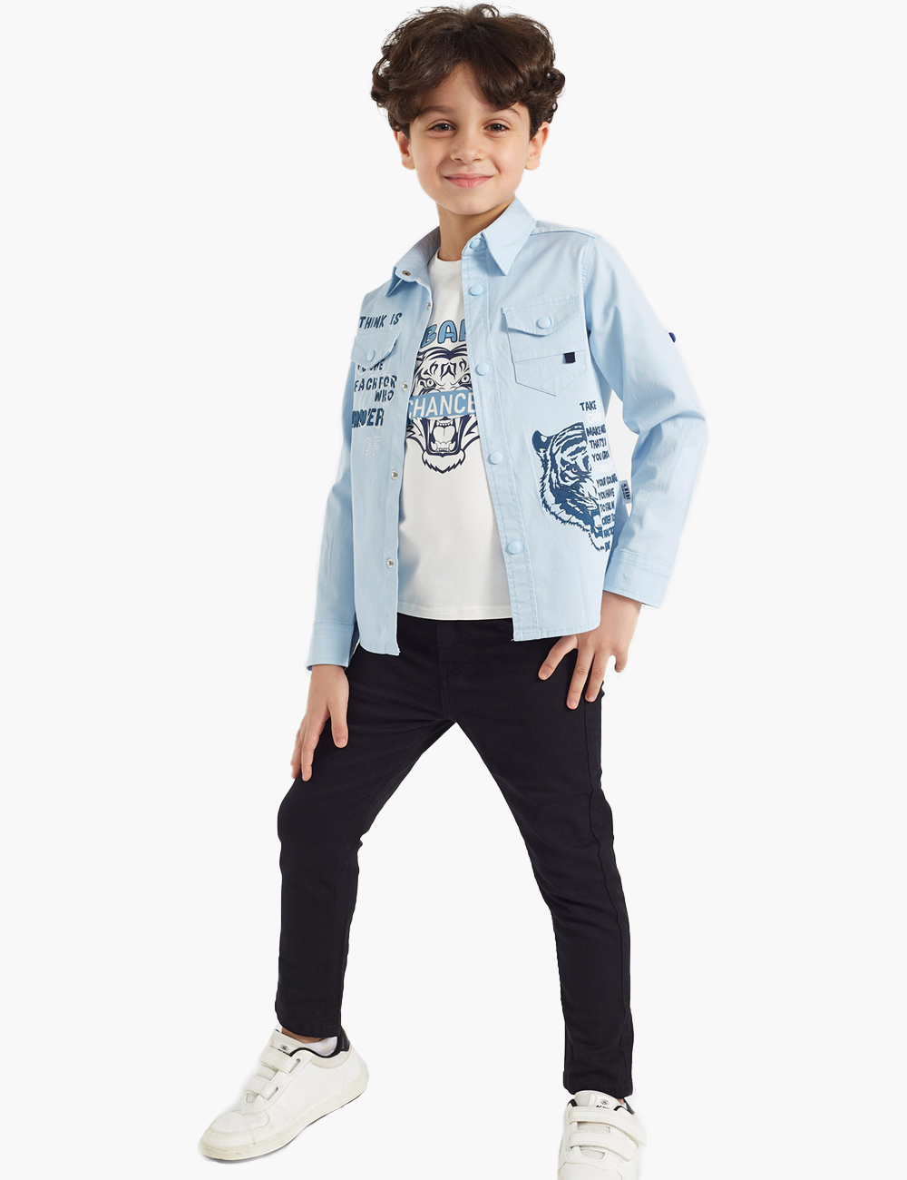 A twin set consists of a gabardine shirt with letters and a tiger face print, along with a white t-shirt printed with letters and a tiger print.